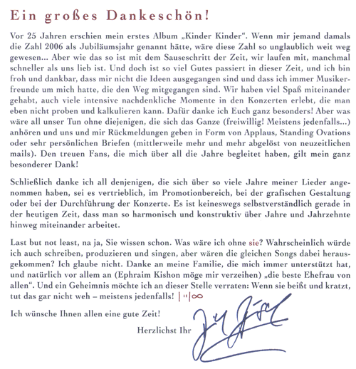 In dem Zusammenhang noch ein paar kleine-grosse Dankeschöns an die vielen Menschen, die mich seit Jahren begleiten und mit Ihrer Arbeit unterstützen. So z. B. die unermüdliche, notorisch gut gelaunte Hamburgerin Rosita Blank-Lübbe, die genauso energiereiche Gevelsberger Kämpferin Renate Stein, meine nimmermüden Konzertveranstalter Marita (sie ist die eigentliche Chefin!) und Lothar Behnke, das gesamte Ganser- Team mit dem positiven Hamburger Weidestrassen-Spirit, dann das seit Jahren bewährte Münchner Element in Gestalt des Grafik- Geschmackspapstes Toni Zinkl (ja so sind sie, die Norddeutschen, wir lasssen auch Euch Bayern mitmachen!). Nicht zu vergessen meine Jungs aus der Band, mit denen ich immer noch gerne auf der Bühne stehe (Ihr auch mit mir? Erwarte diesbezügliche eindeutige e-mails!). Und schliesslich natürlich meine Familie, allen voran die Katze, die mich immer noch aushält und immer wieder motiviert – „wenn ich mal down bin, hilfst du mir aufzustehen“. Gut, dass es Euch gibt!